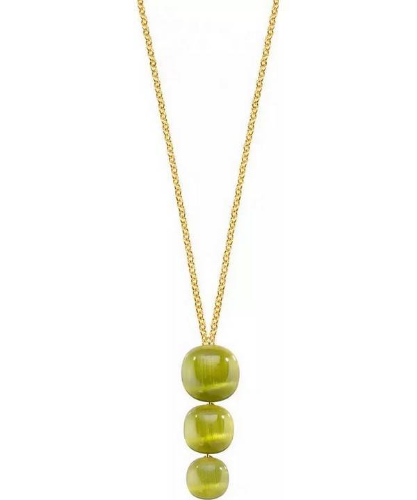 Features Gold Tone Chain, Three Cabochon Stones, Cat Eye Crystals Pendant, Lobster Clasp
